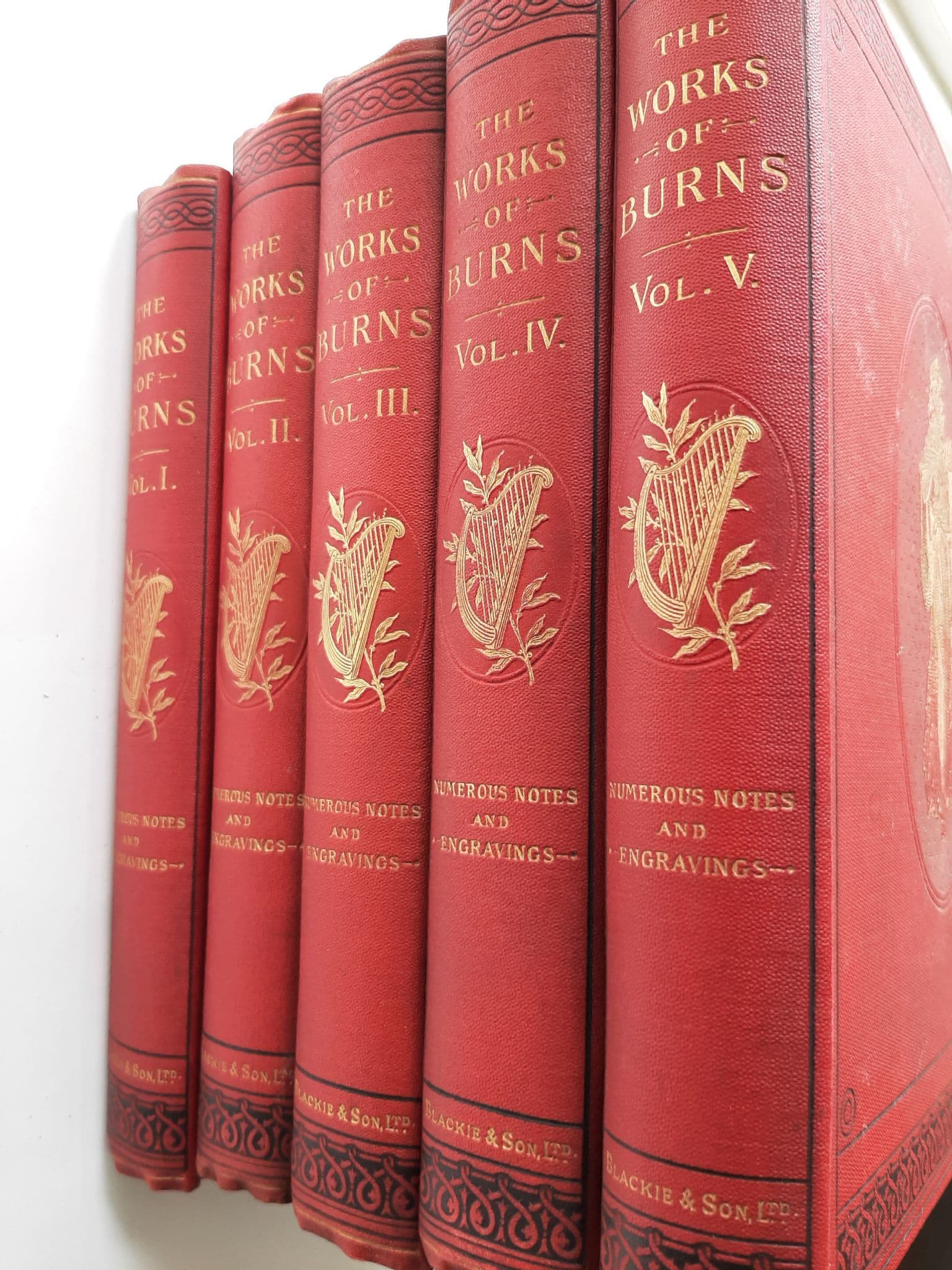 Blackie & Sons, London, 1888, vg, boxed set in original box. VG+/gd Books with scarlet cloth boards, gilt cameo to front and spine, black decorative borders to front, back and spine, gilt page edges, bevelled boards, numerous tissue guarded illustrations. Marginal glossary, numerous notes, and appendixes. Books in exceptionally good condition. Original box spilt along hinge edge. The works also contain The Life of Burns by J G Lockhart, and essays on the genius, character and writings of Burns, by Thomas Carlyle and professor Wilson. Very heavy item - UK mainland delivery only. BURNS, POETRY, SCOTTISH LITERATURE, ANTIQUARIAN, BOXED SET